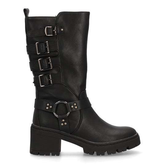 Botín de mujer estilo biker con caña media y cierre lateral de cremallera.
