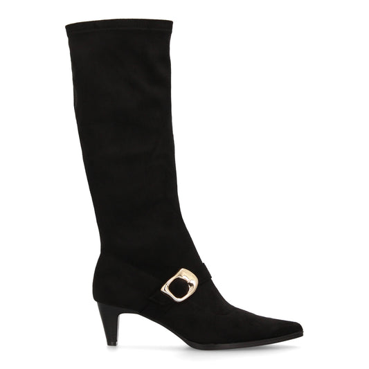 Bota alta de caña media diseño llamativo y sofisticado. Punta fina y tacón