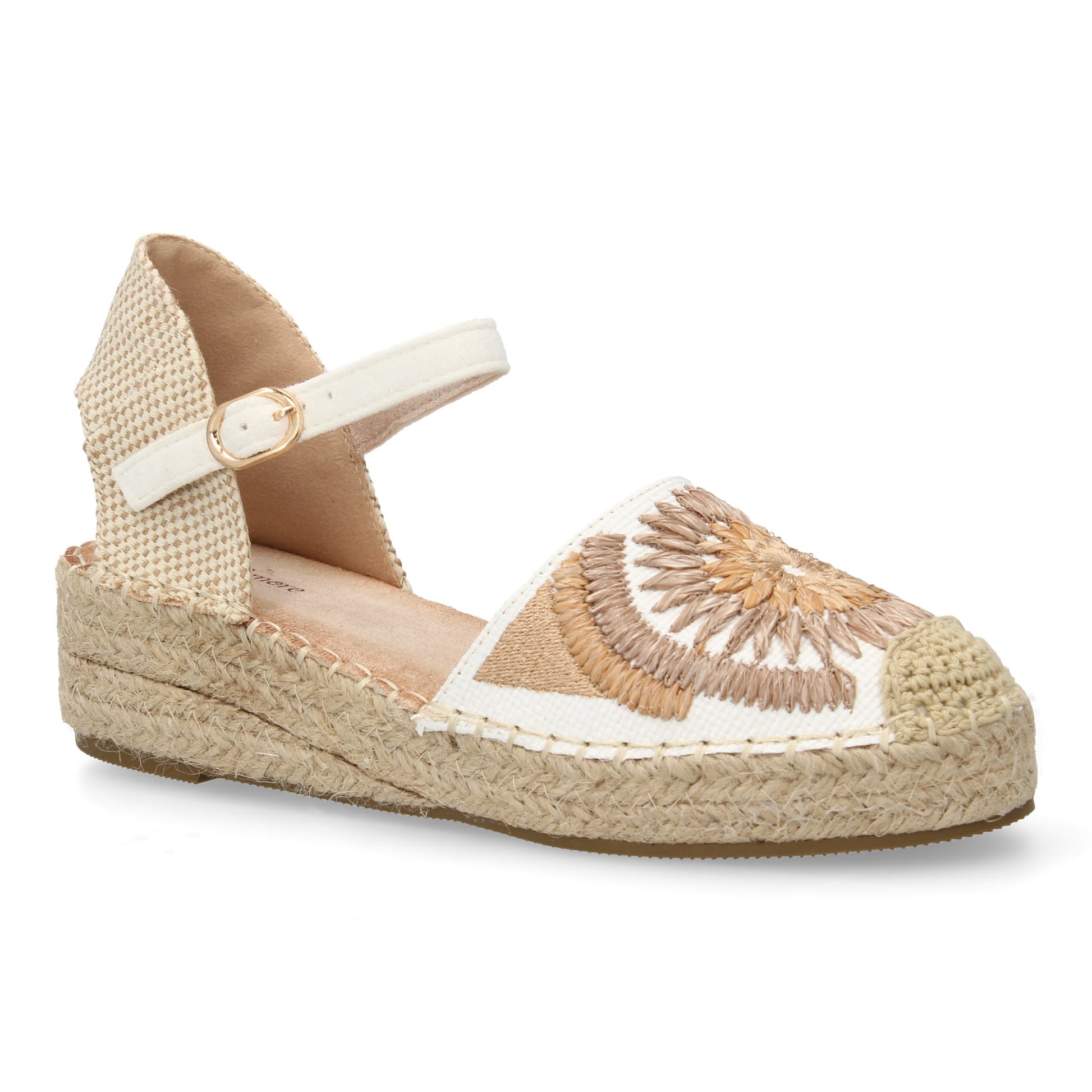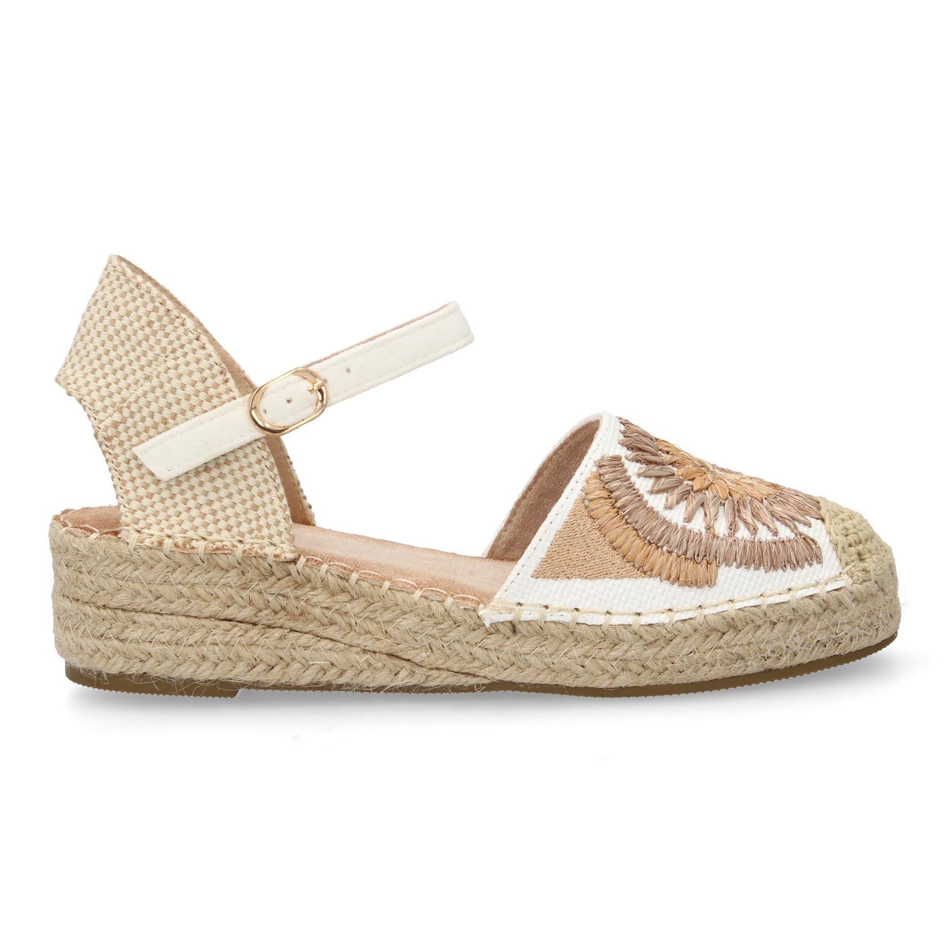 Sandalia de cuña de yute para mujer comodas y elegantes diseño de flores bordadas en la pala y cierre de hebilla ideales para primavera-verano.