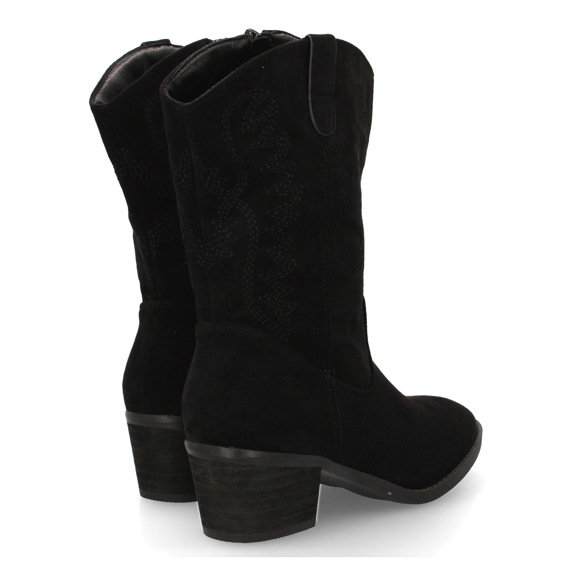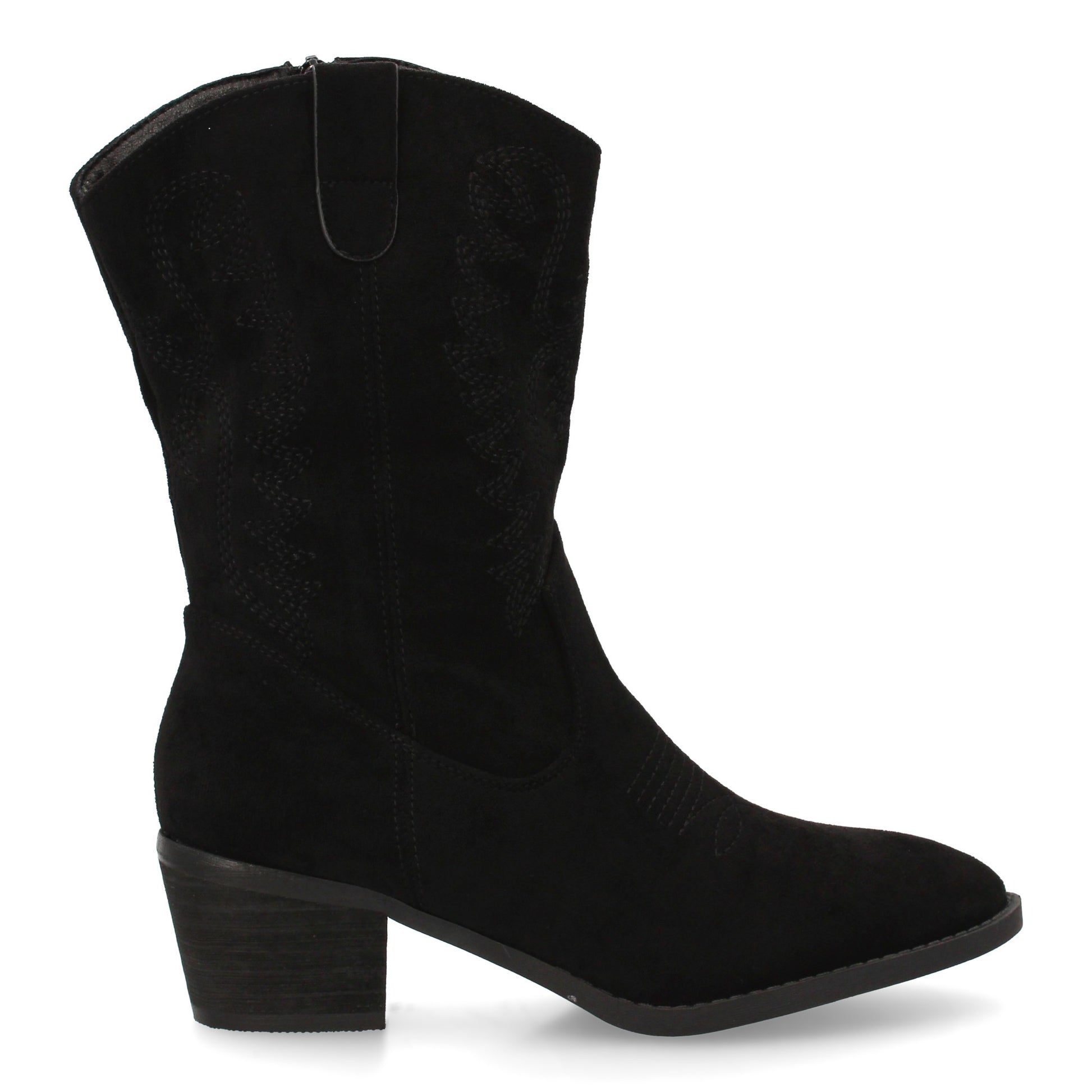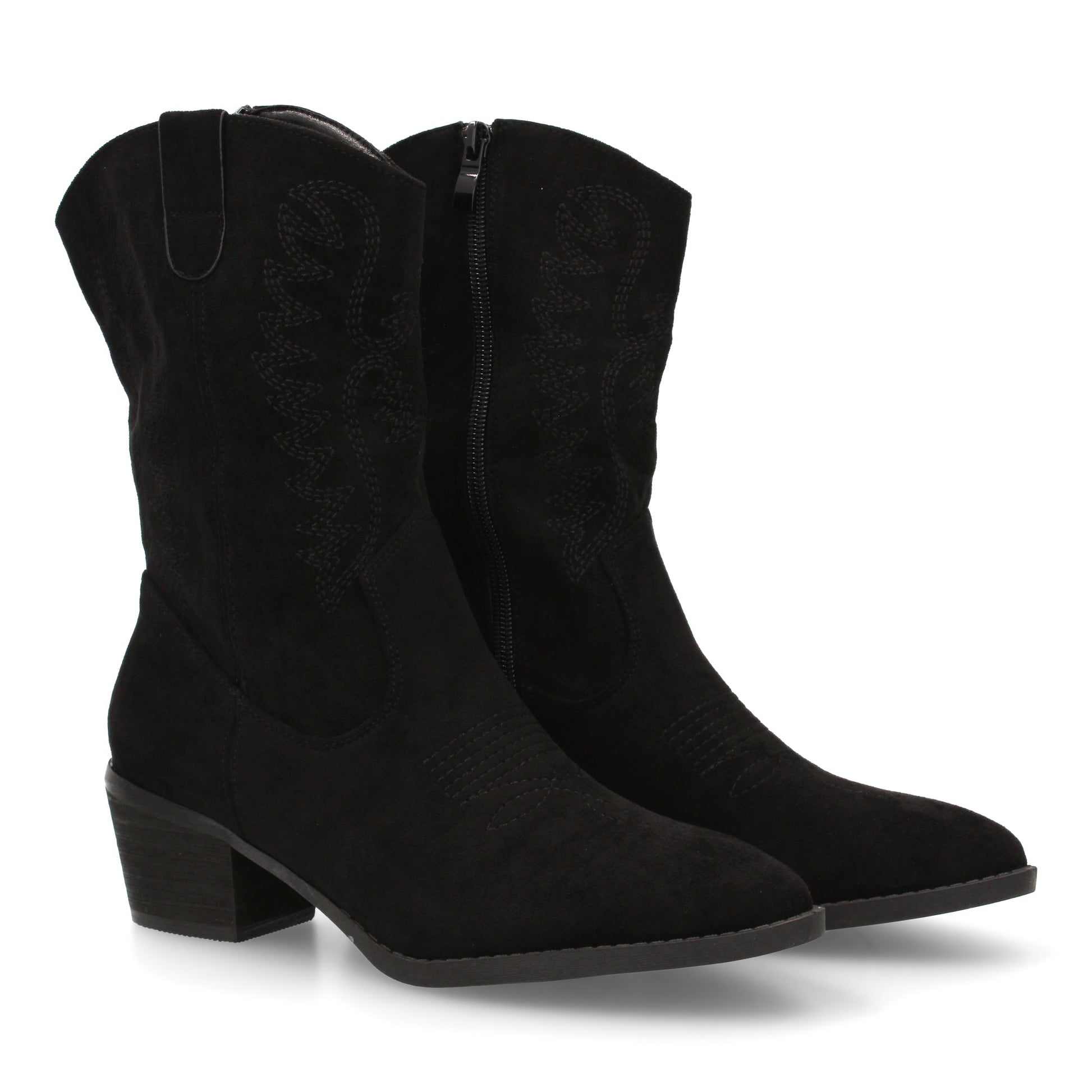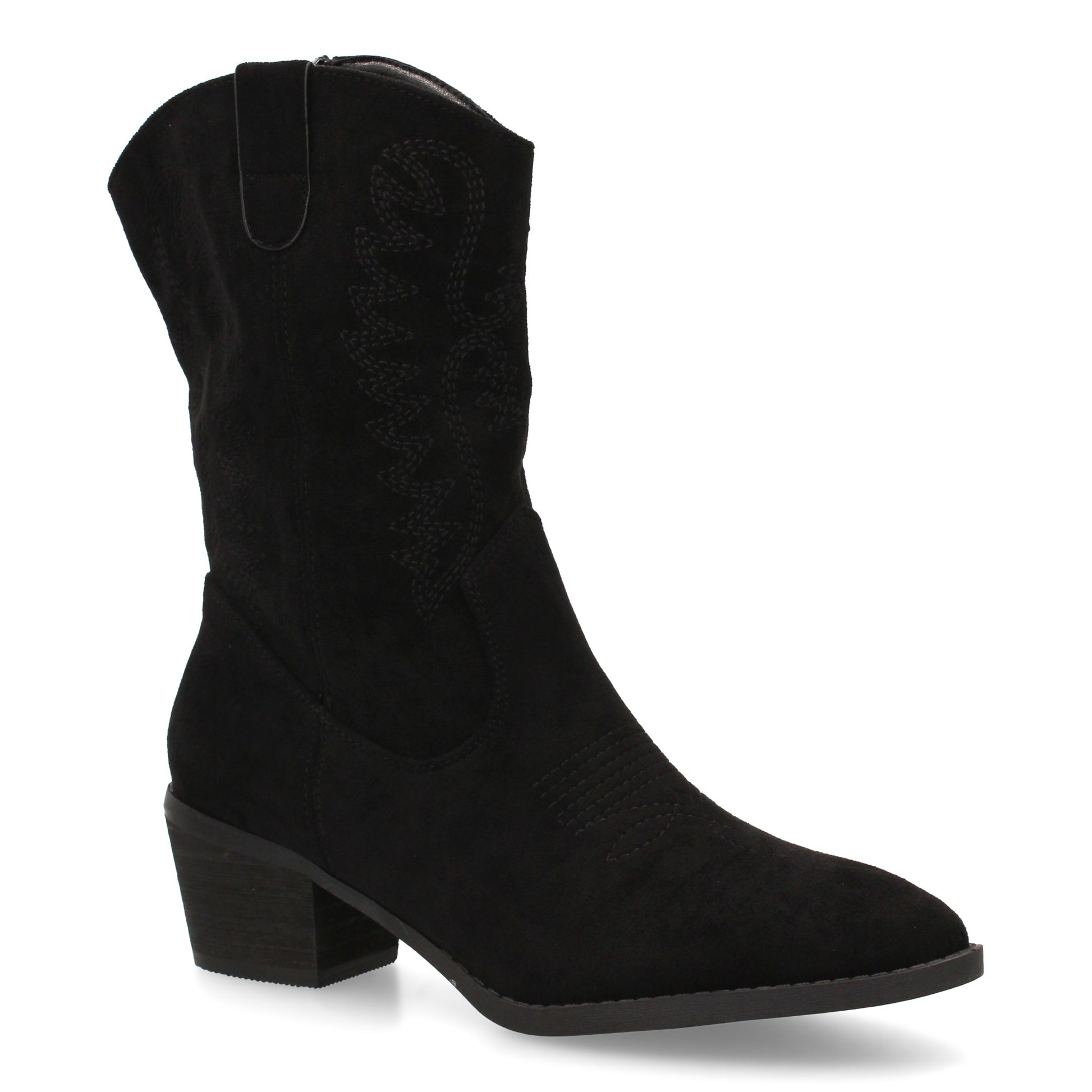 Bota cowboy de caña media con bordados frontales y laterales punta fina. tacón ancho comodo ideal para mujer en temporada Otoñoo invierno. Cierre de cremallera.