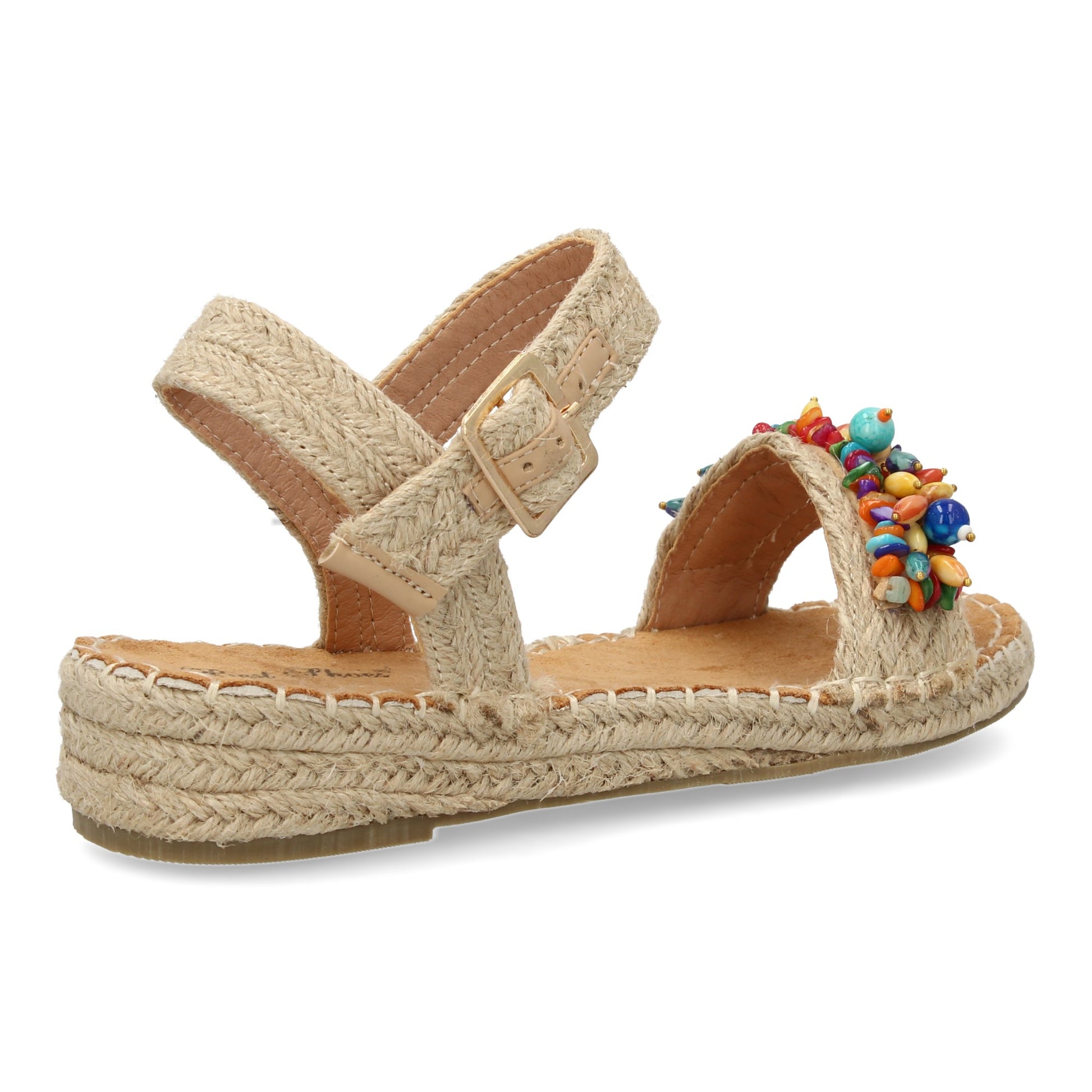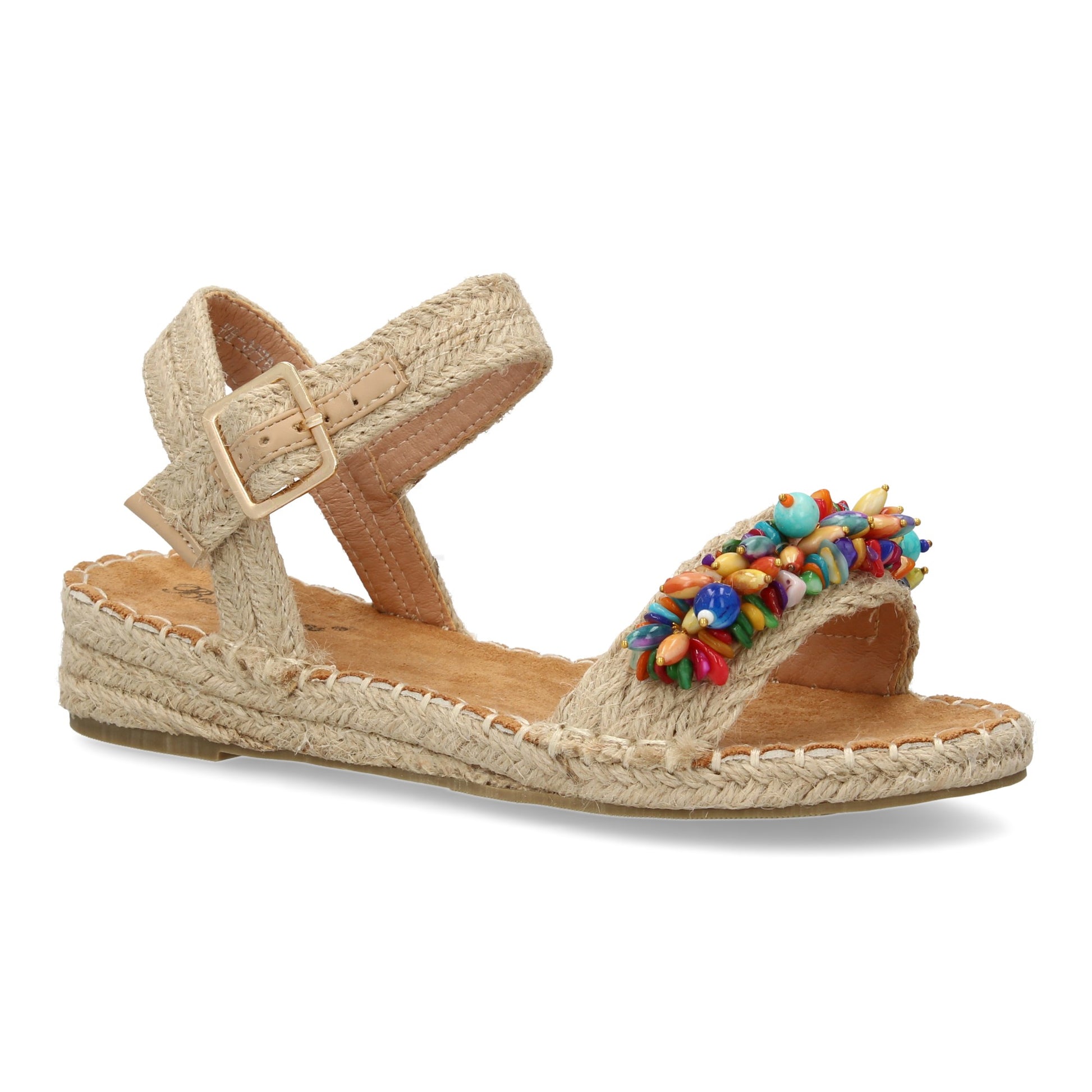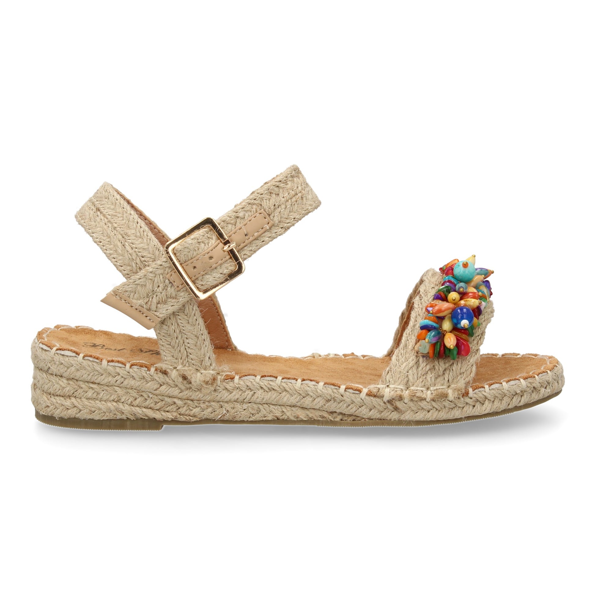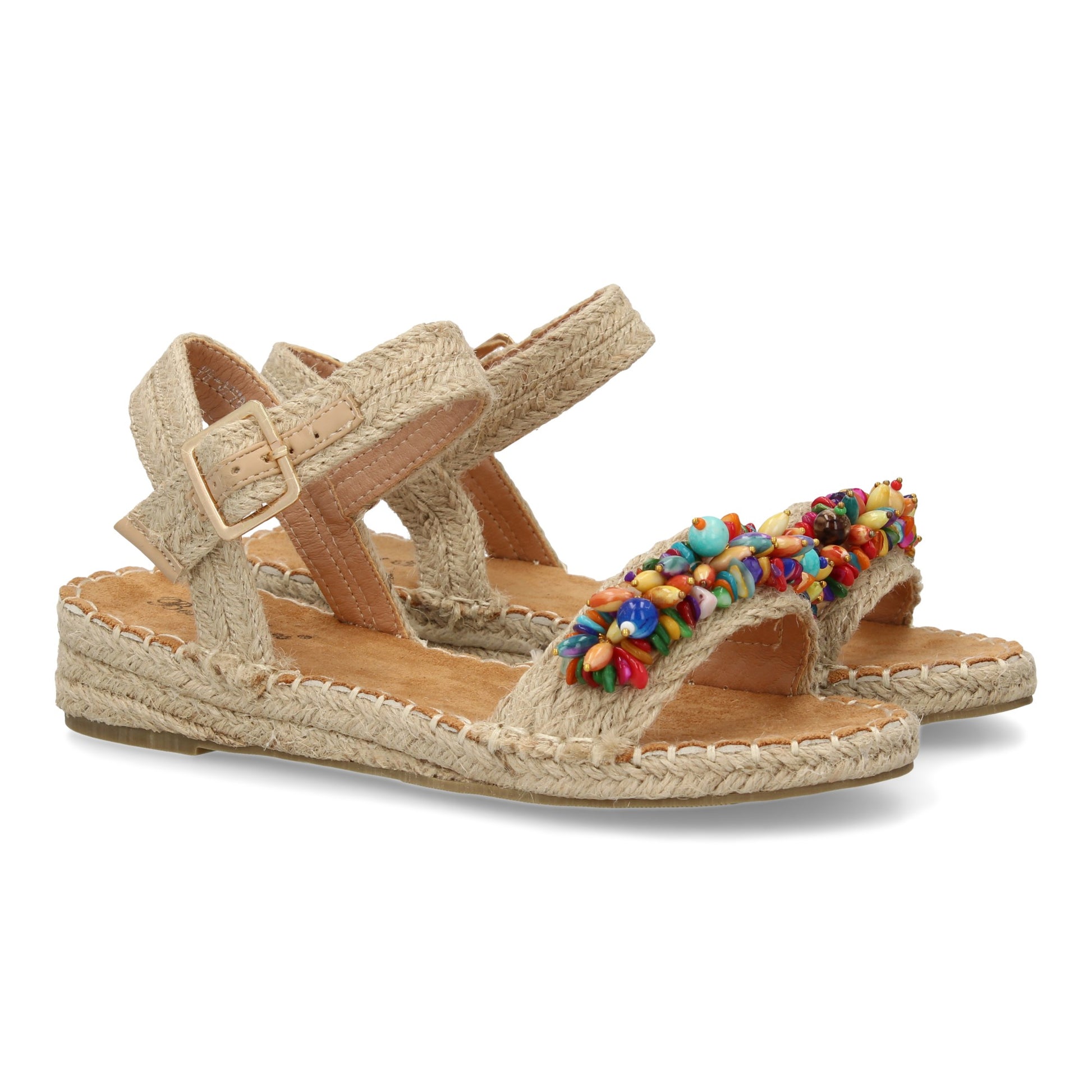 Sandalia plana de yute para mujer comodas y elegantes diseño moderno con adorno en la pala y cierre de hebilla.