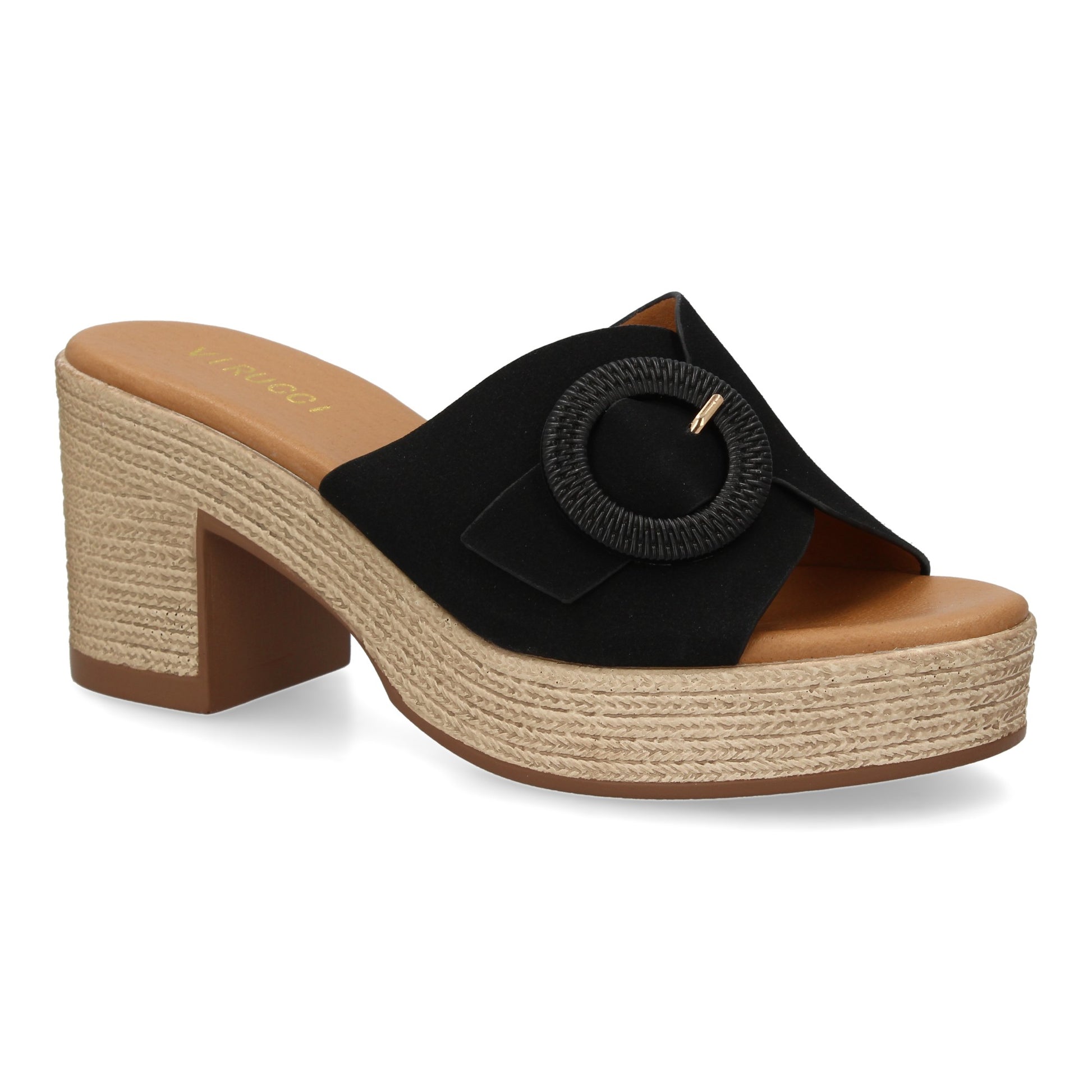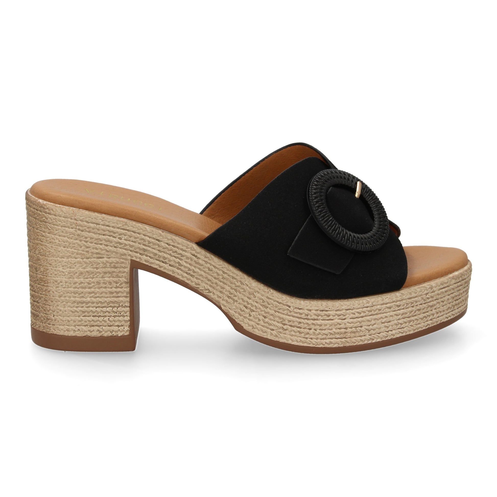 Zueco de tacon comodos y elegantes diseño moderno con hebilla decorativa en la pala ideales para primavera verano.