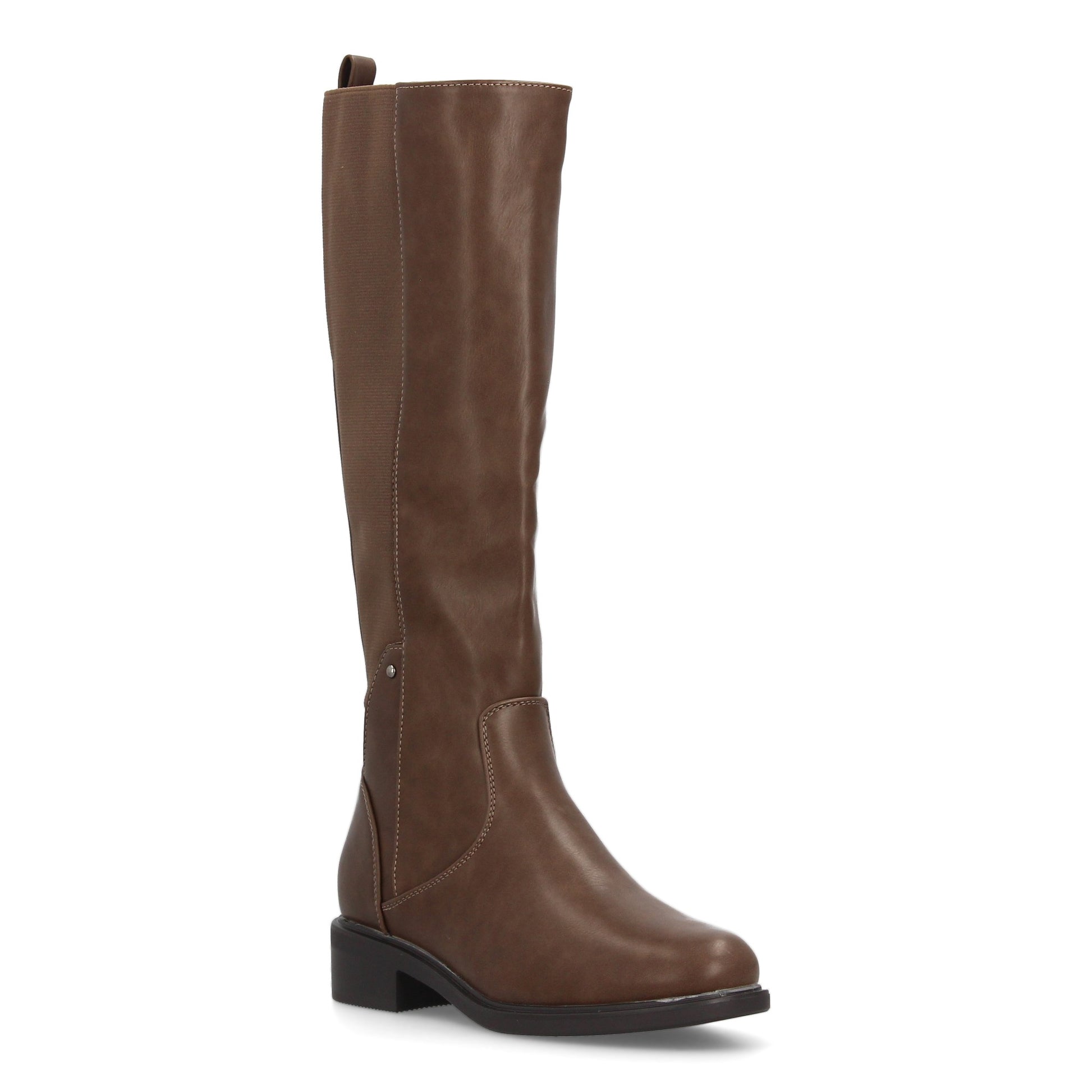 Bota alta con caña elástica en la parte trasera que se adapta perfectamente a la pierna para una mayor comodidad. Estampado liso y cierre de cremallera suela plana con tacón bajo. Para mujer ideal temporada otoño invierno.