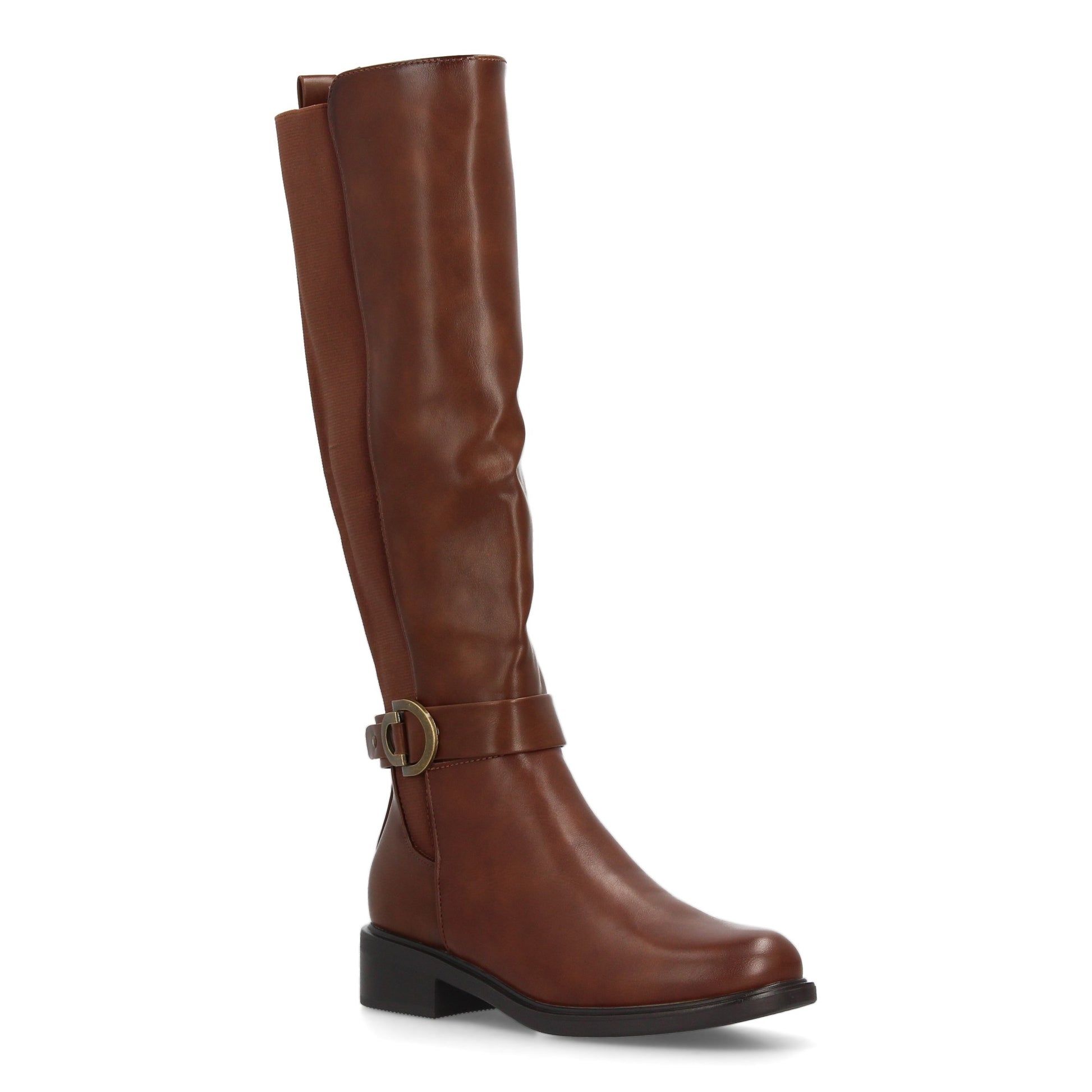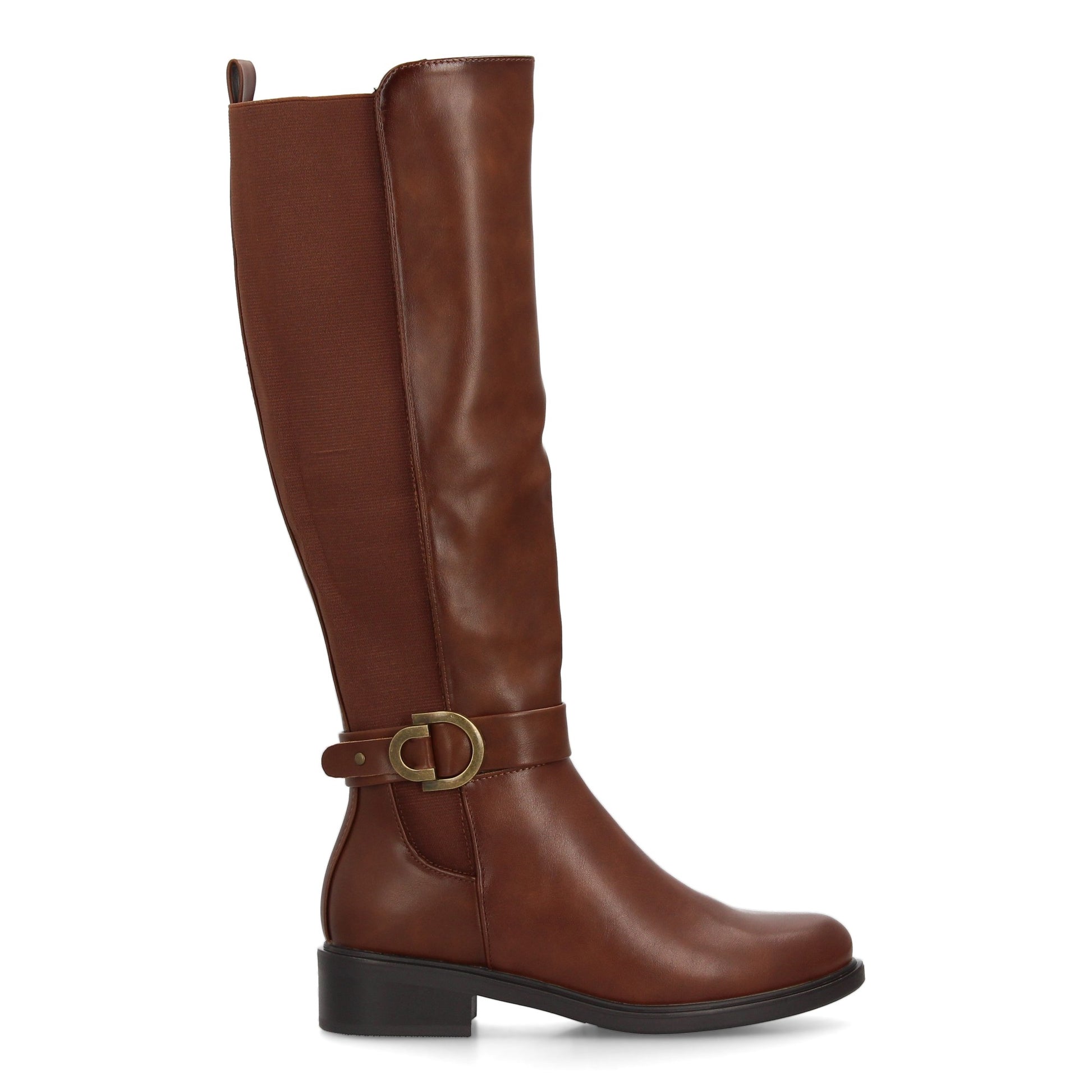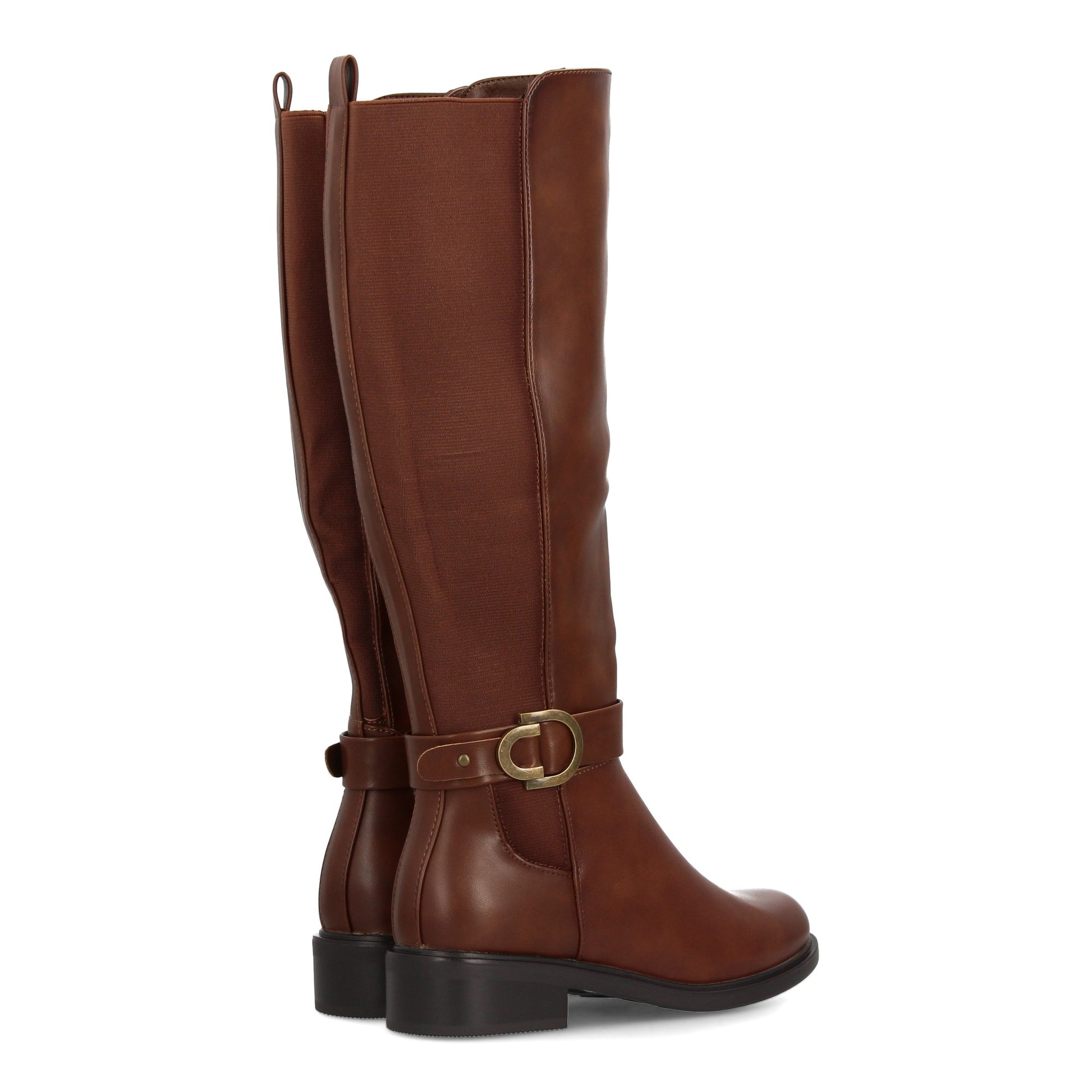 Bota alta de mujer con caña lisa para mujer. Cierre de cremallera suela plana con tacón bajo. Hebilla decorativa. Ideal temporada otoño invierno.