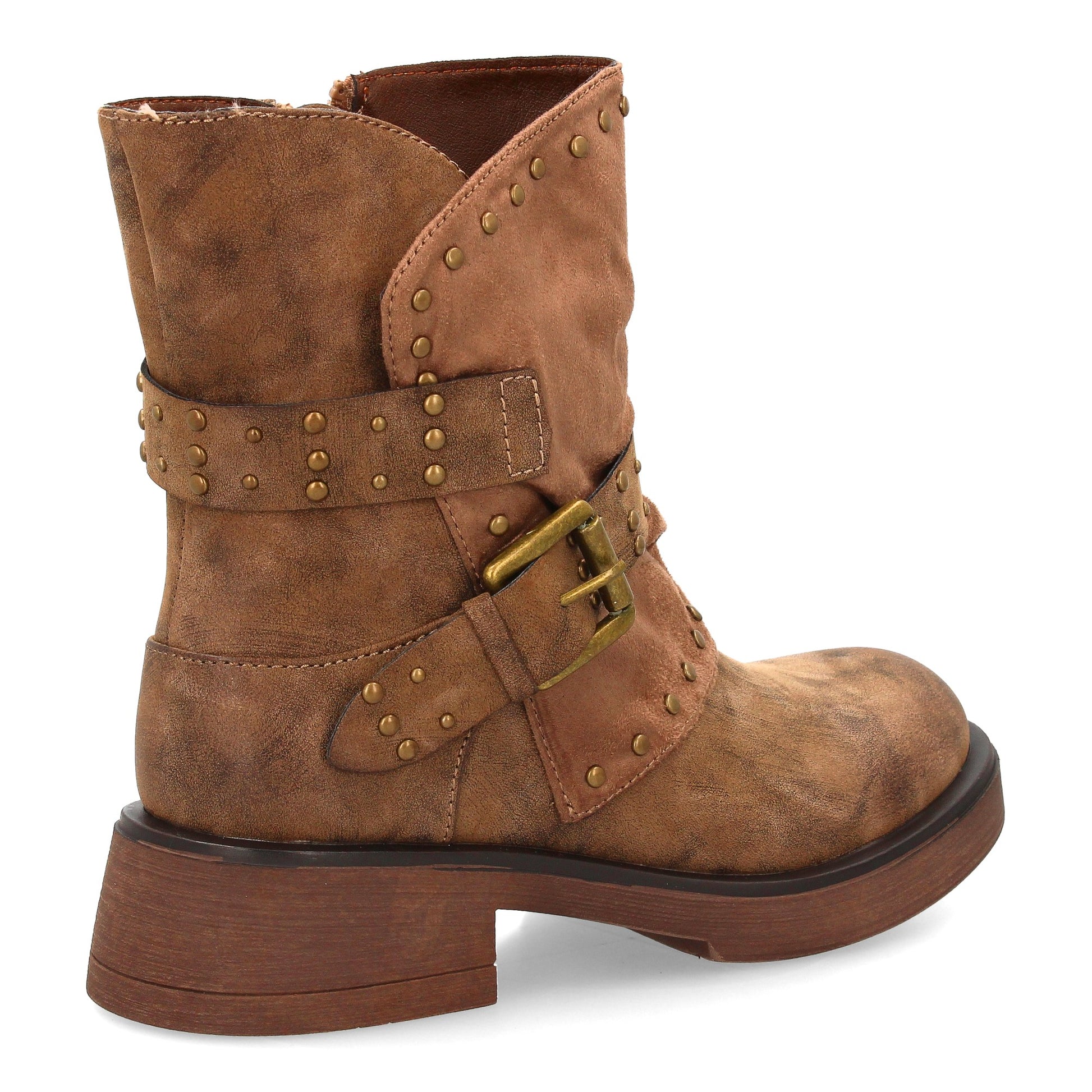 Bota de mujer estilo biker con diseño robusto y urbano perfecta para destacar en la temporada otoño Invierno. diseño que combina materiales lisos y texturizados decorados con tachuelas metálicas y doble correa con hebilla ajustable.