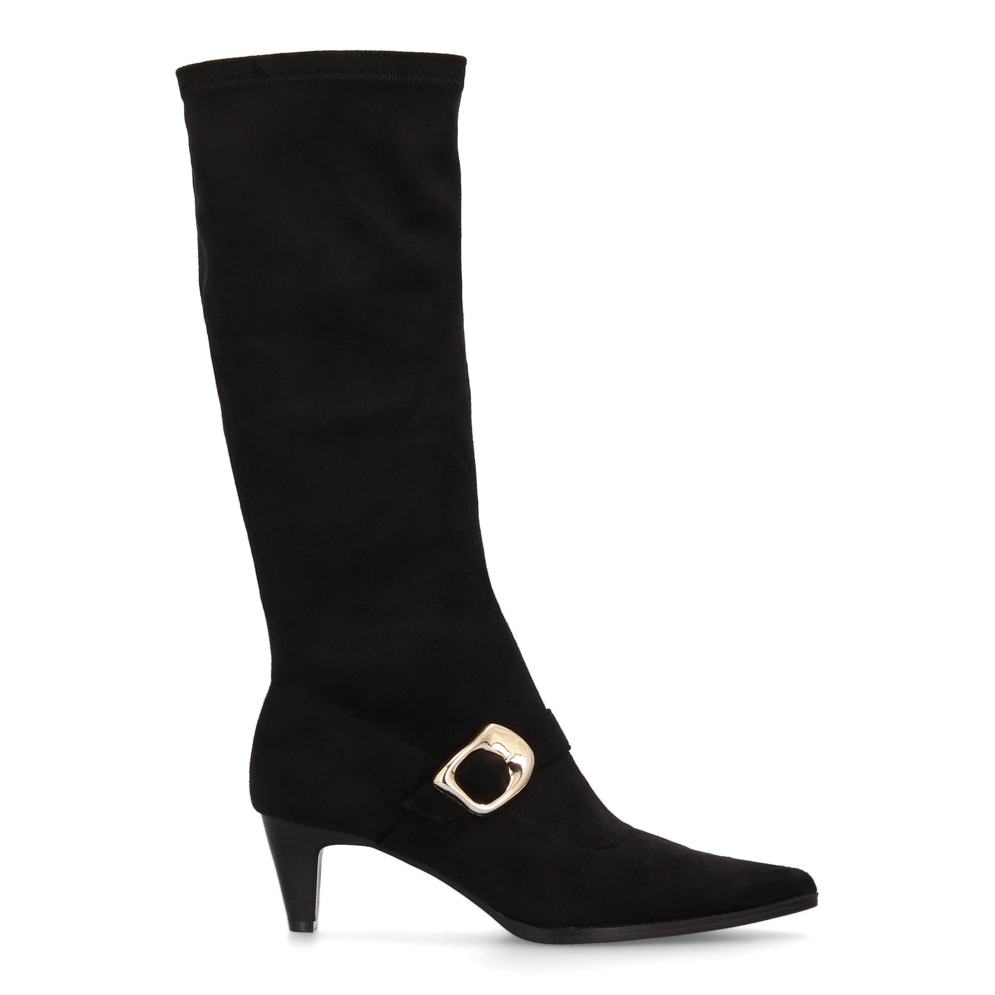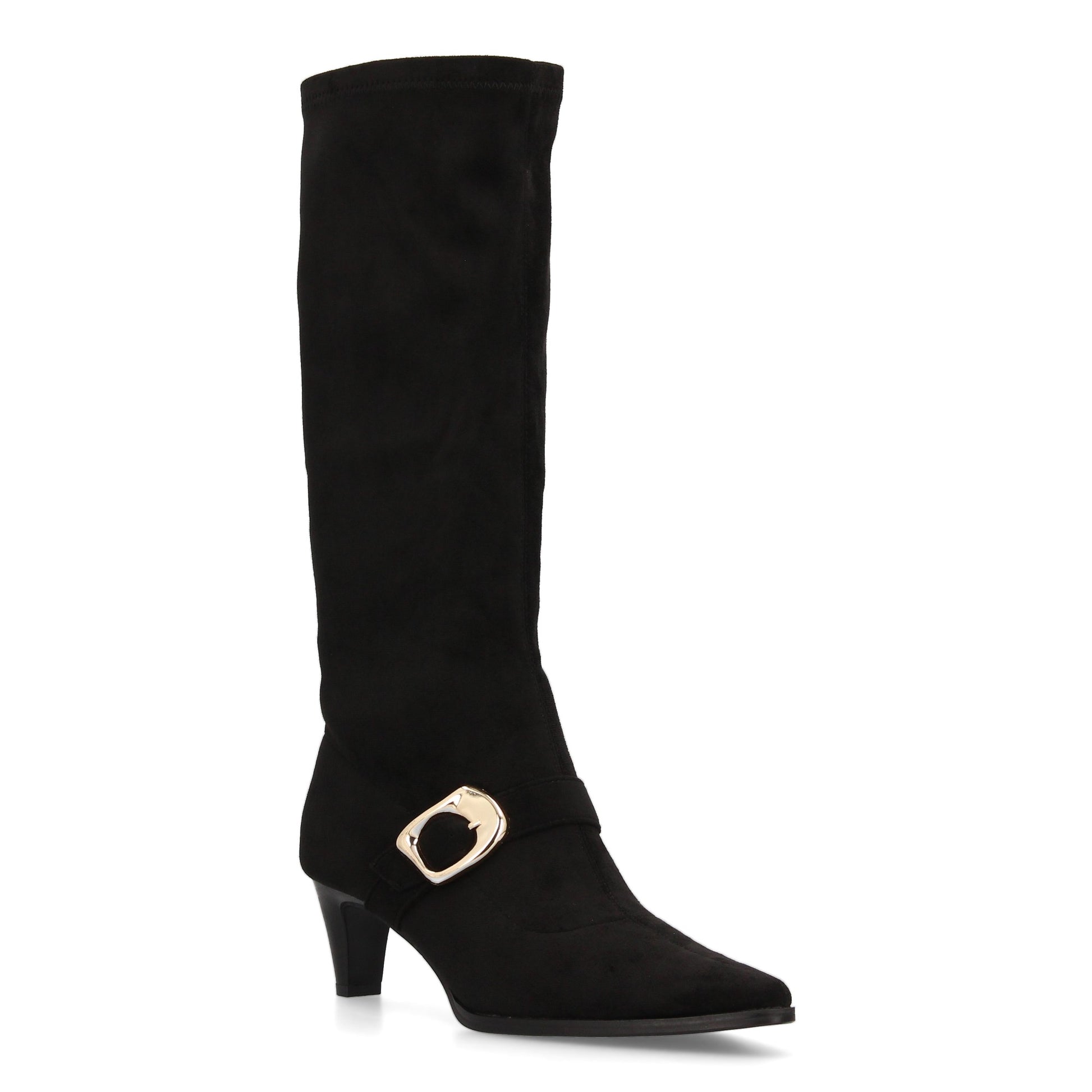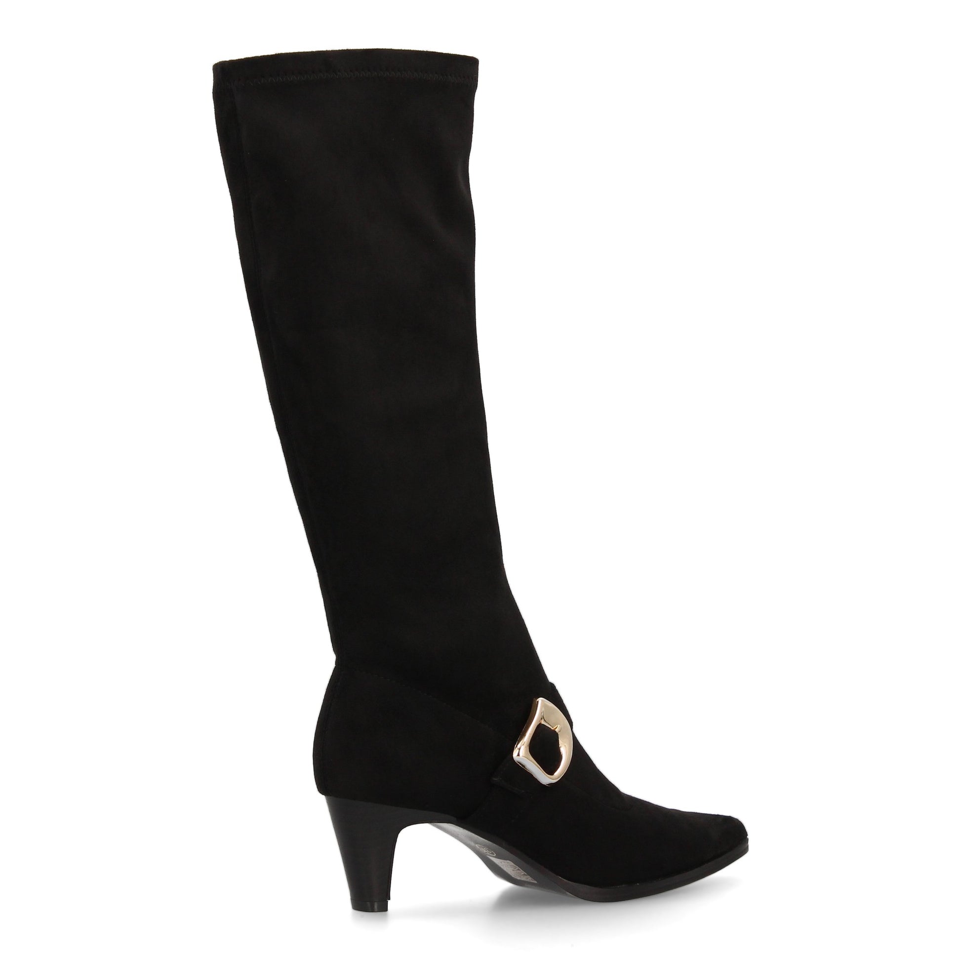 Bota alta para mujer con punta fina y tacón estampado liso elegante. Hebilla grande decorativa. Ideal temporada otoño invierno.