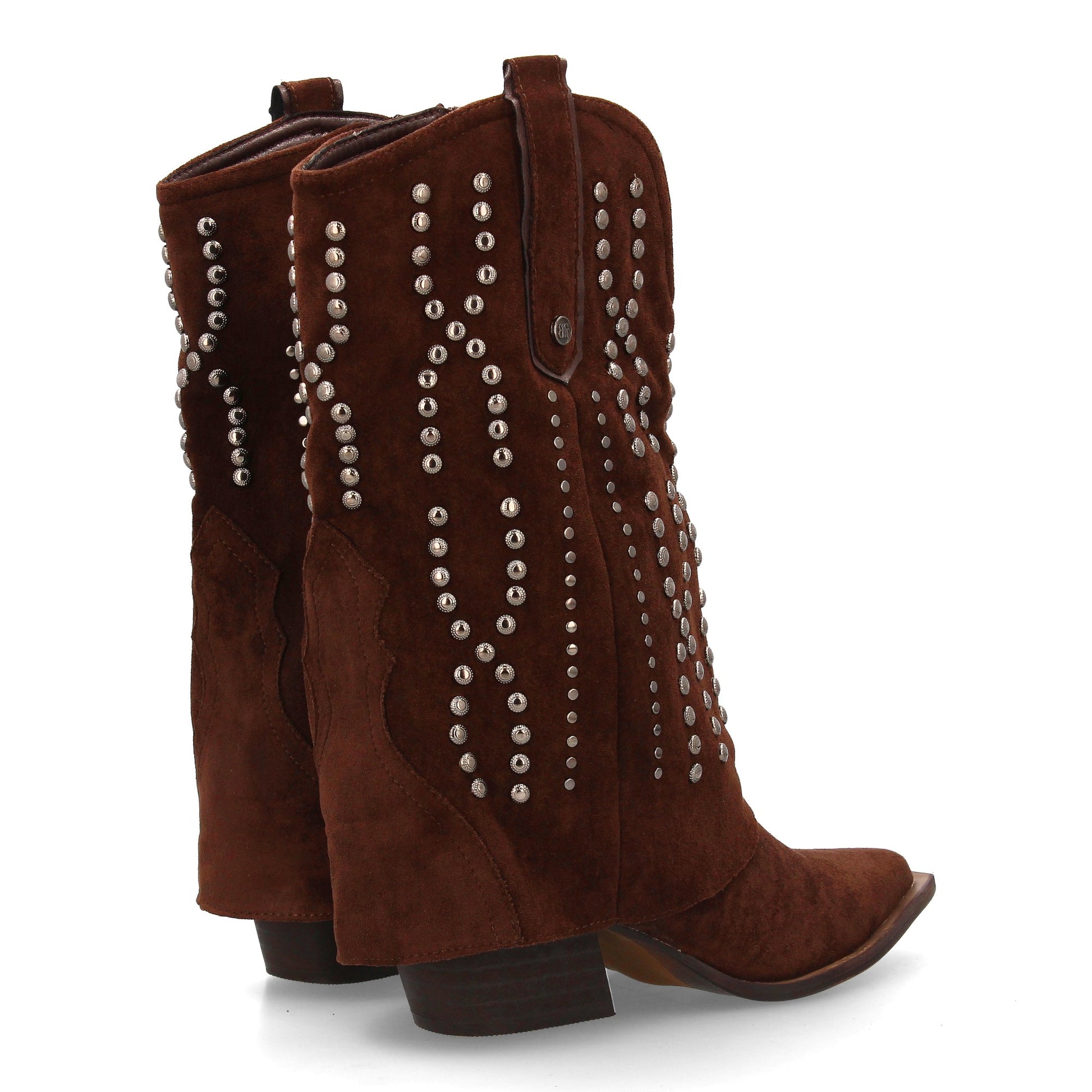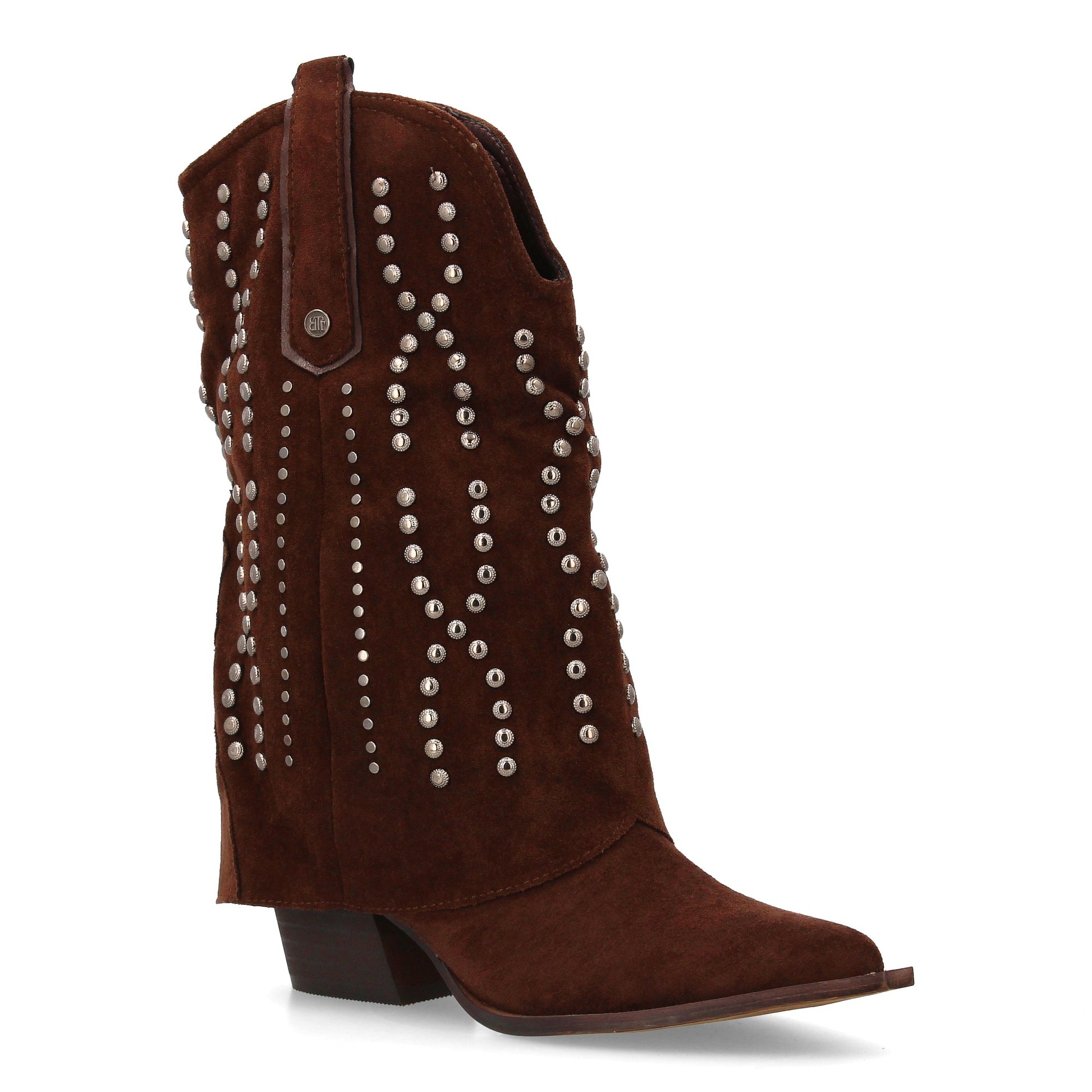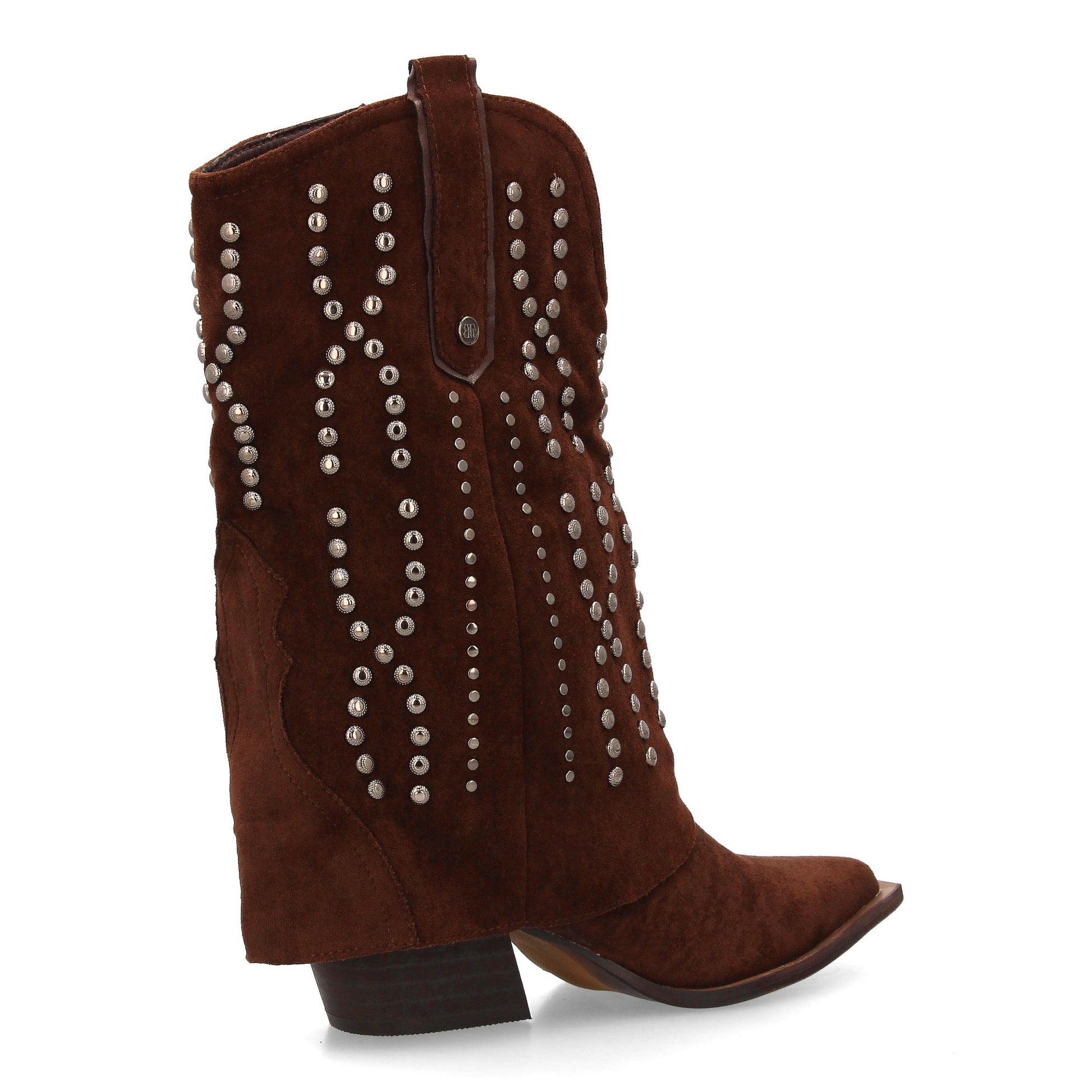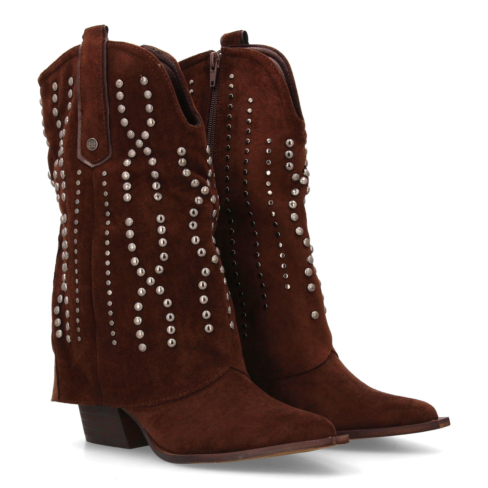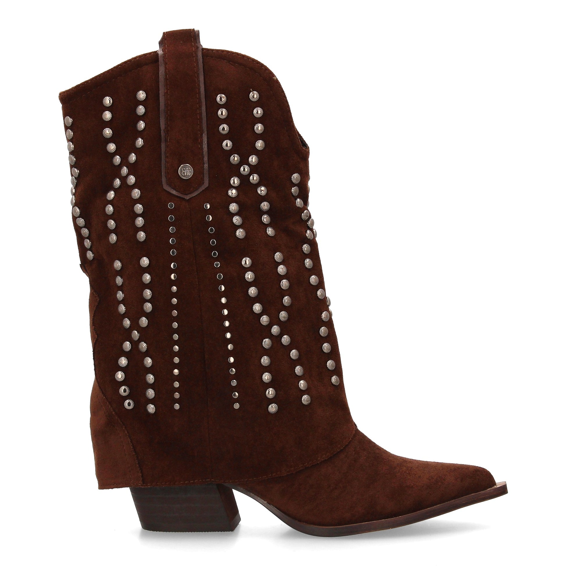 Botín cowboy para mujer con caña media y diseño campero. Decorado con tachu