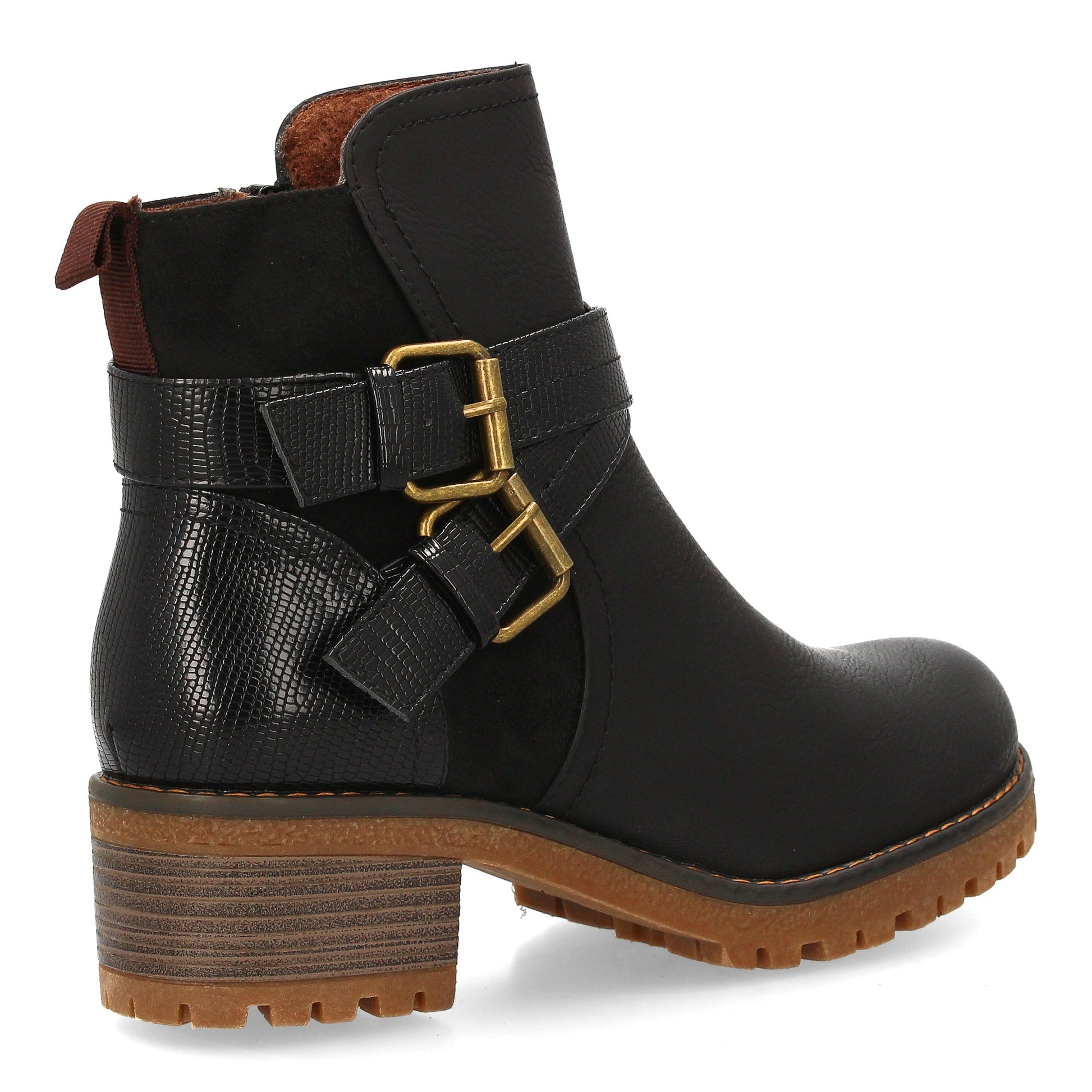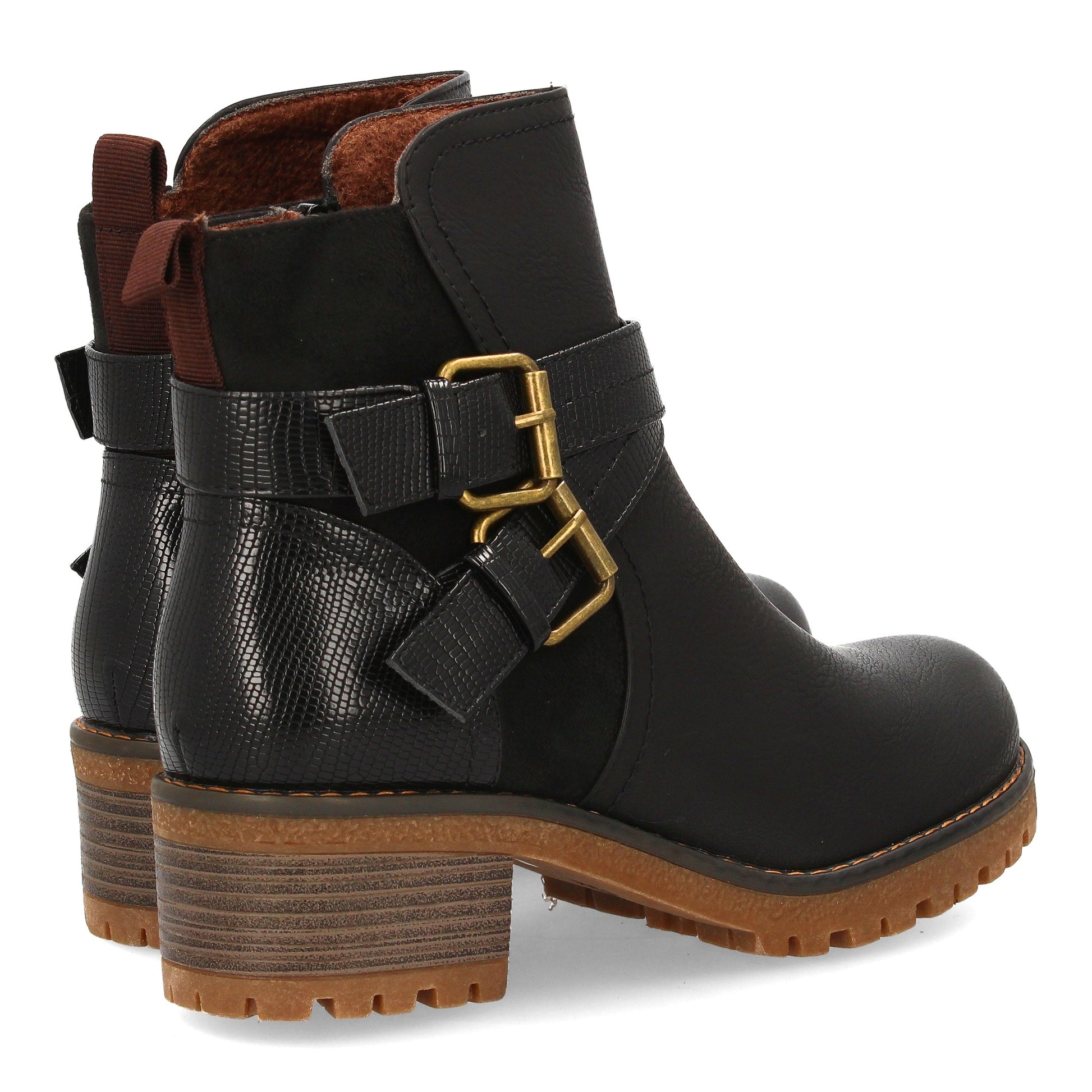Botín de mujer con tacón. Ideal para los días de otoño e Invierno. Texturas combinadas con doble hebilla dorada decorativa en el lateral. Suela dentada de goma. Cierre lateral con cremallera.