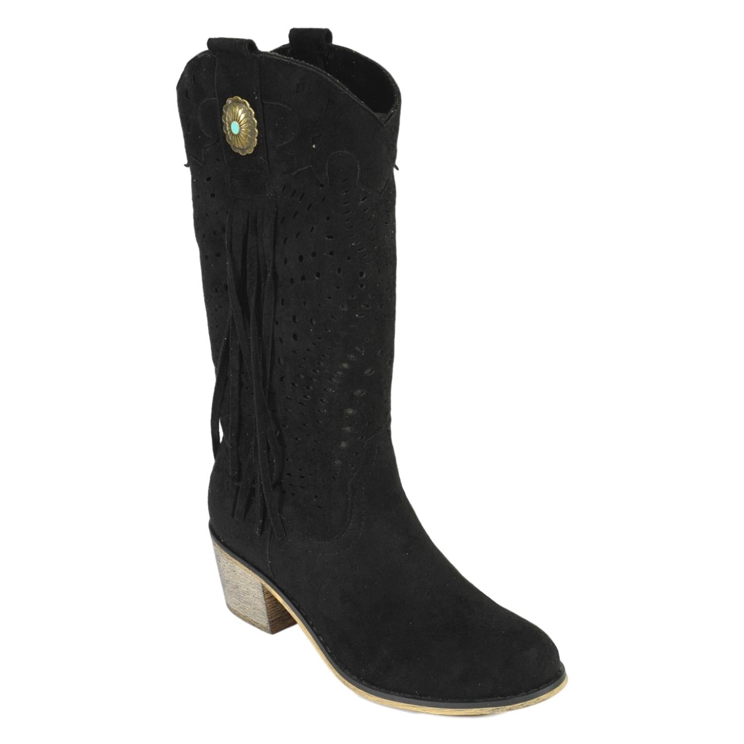 Bota de Mujer Estilo Campero con Tacon Adorno Metalico en caña con Flecos y Cierre de Cremallera. Primavera Verano