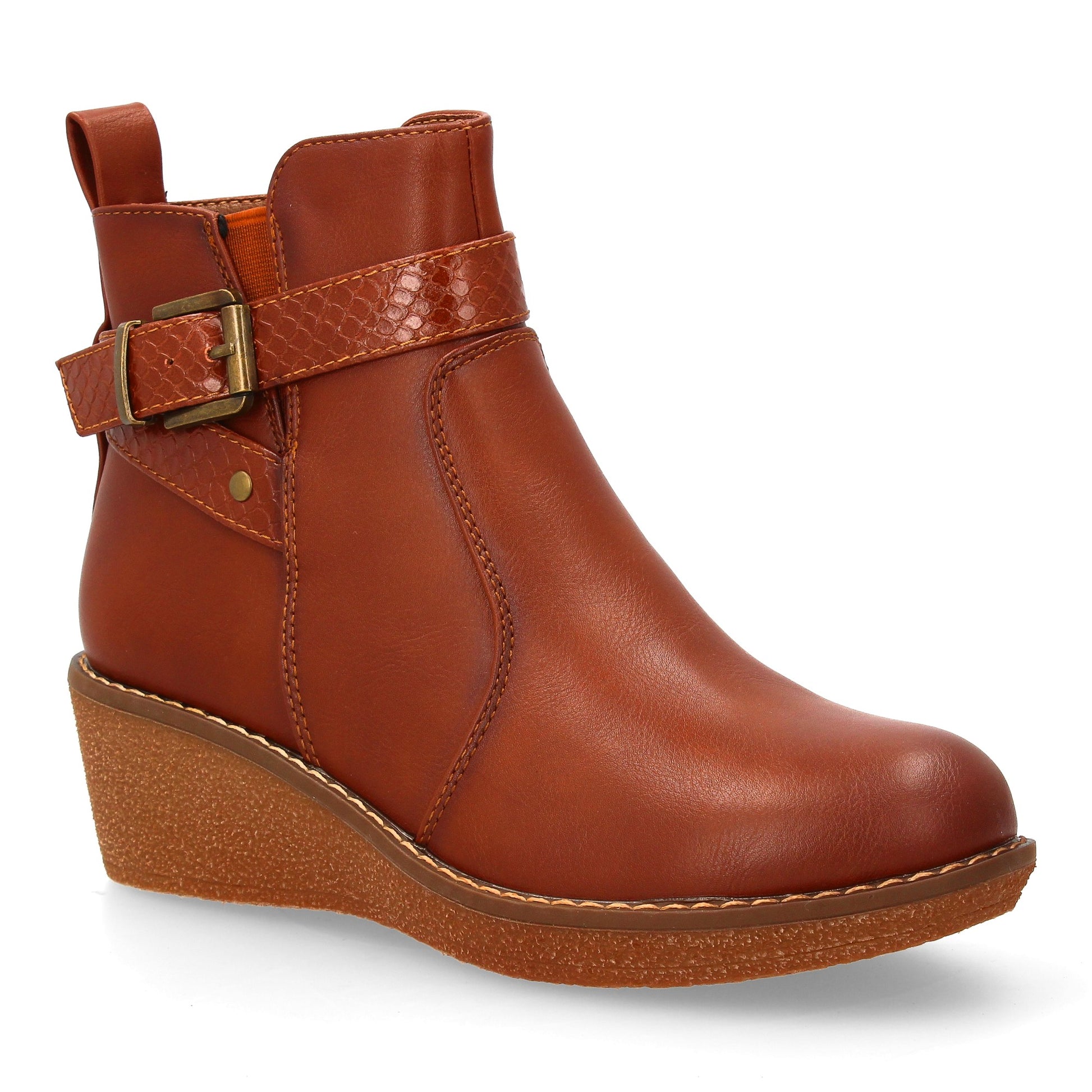 Botín con cuña para mujer elegante tira con textura de efecto serpiente y hebilla decorativa metálica en el lateral exterior. Cremallera interior ideal para la temporada de otoño invierno.
