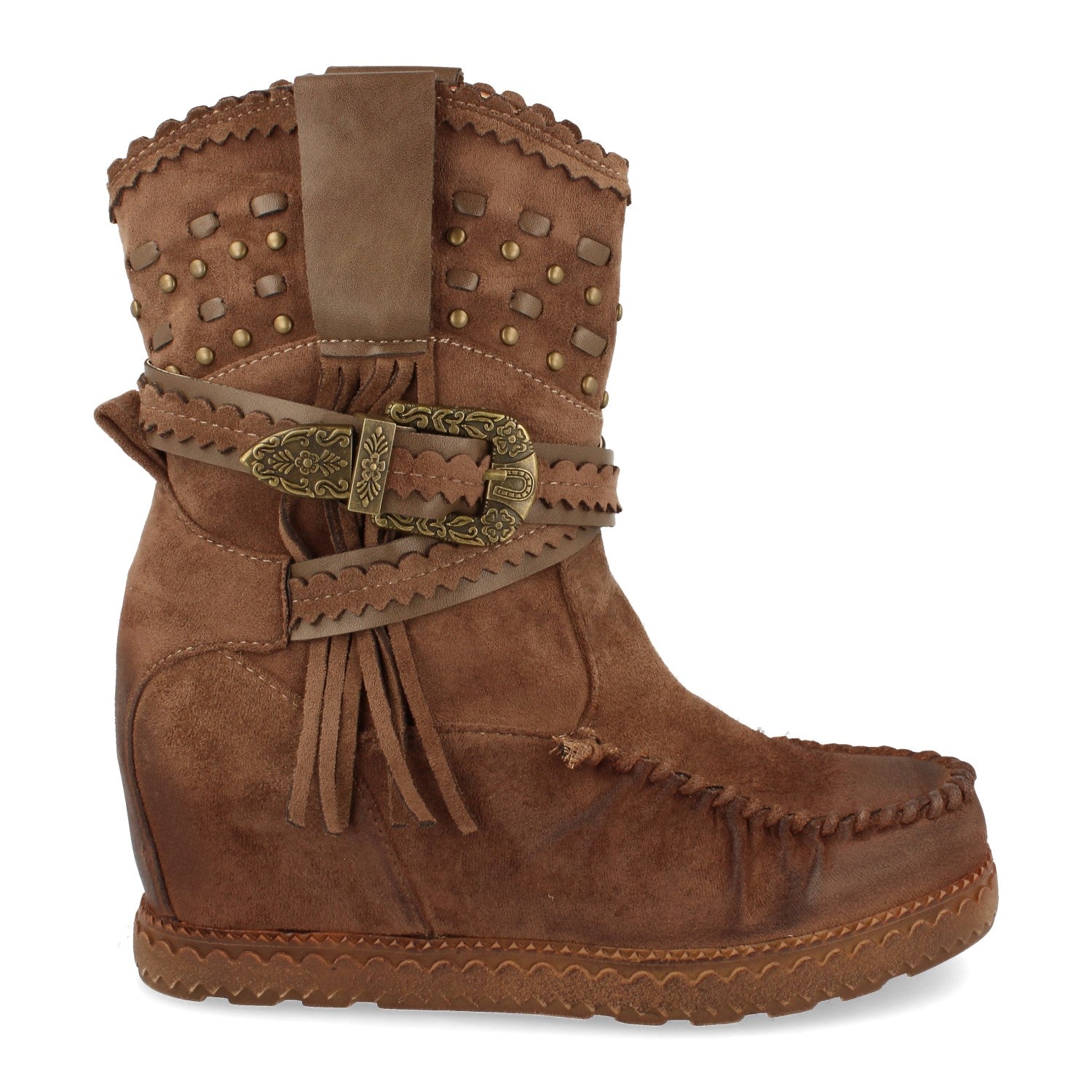 Bota de Estilo Indio Correas con Hebilla Flecos en Caña Cuña Interior y Cierre de Cremallera Otoño Invierno